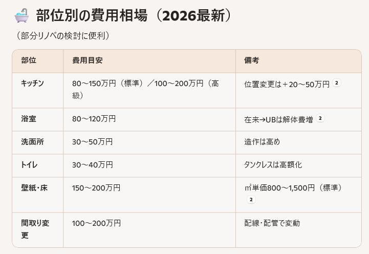 🧱 リノベーション費用の種類別・最新相場(2026)
